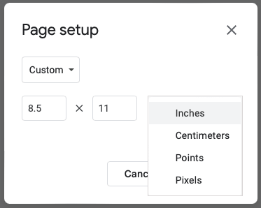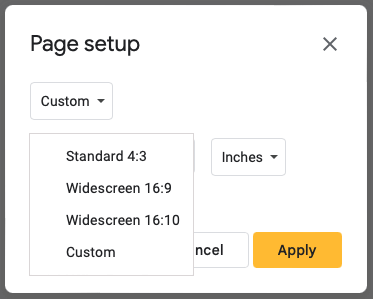- Slayt boyutu için kullanmak istediğiniz boyutları girin ve ölçümü sağa seçin. İnç, santimetre, puan veya piksel seçebilirsiniz. Yine, yukarıda listelenen kağıt boyutlarını veya özel boyutlarınızı kullanabilirsiniz.