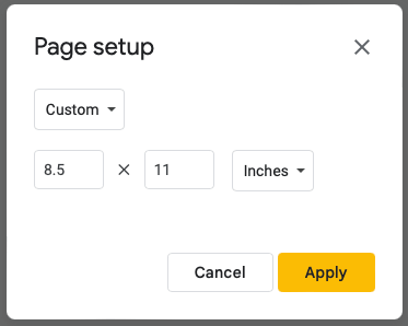 SeçmeDosya>Sayfa kurulumumenüden. Açılır kutuda seçinstandart yatay boyutlardan biri veya kullanınGelenekBoyutlarınızı girme seçeneği. Sonra seçinUygula.