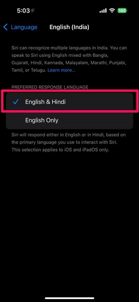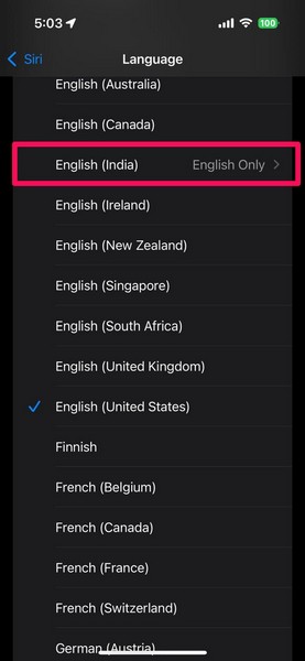 5.Burada dokununİngilizce ve Hintçe SeçenekileBirincil Siri dili olarak ayarlayıniPhone'unuzda.