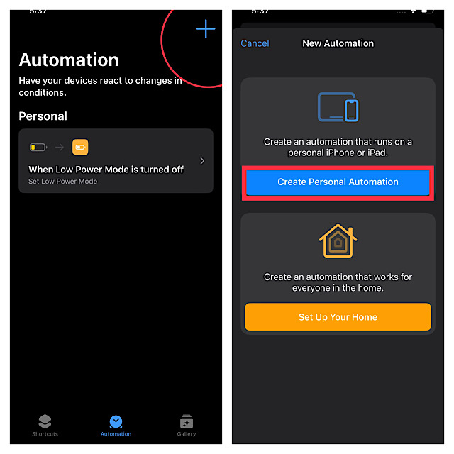 2.Şimdi dokunun“+” düğmesiekranın sağ üst köşesinde veKişisel Otomasyon Oluşturundüğme.