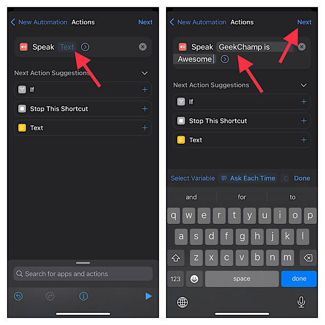 7.Burada, otomasyon çalıştığında Siri'nin söylemesini istediğiniz şeyi yazın ve dokununSonrakiekranın sağ üst köşesinde.