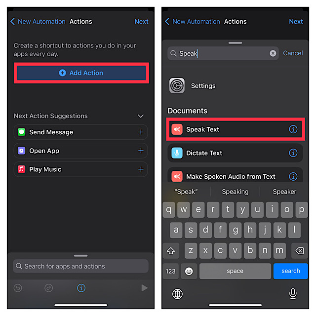 Ardından, arama çubuğuna dokunun ve “Konuş” yazın. Ne zaman"Metin konuş"Seçenek listenin üstünde görünür, eylemi eklemek için dokunun.