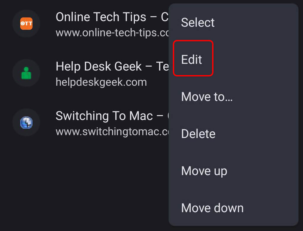 Bir android cihazda bir yer işareti düzenlemek için dokununDaha>Yer imleri. Sonra, düzenlemek istediğiniz yer işaretinin sağında dokununDaha>Düzenlemek.