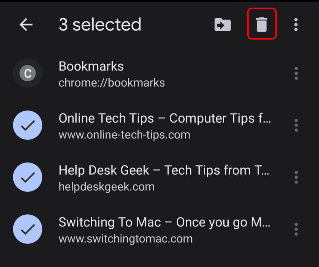 Bir Android cihazında dokununDaha>Yer imleri. Ardından, silmek istediğiniz yer işaretinin sağında dokununDaha>Silmek. Birden fazla yer imle silmek için, silmek istediğiniz her yer işaretine uzun süre basın ve ardındanSilmek(Çöp kutusu) simgesi.