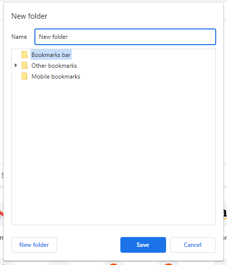 Ayrıca, bir bilgisayardaki Chrome'daki yer imleri çubuğuna sağ tıklayabilir ve seçebilirsiniz.Klasör ekle. Yeni klasörü adlandırın ve seçinKaydetmek.