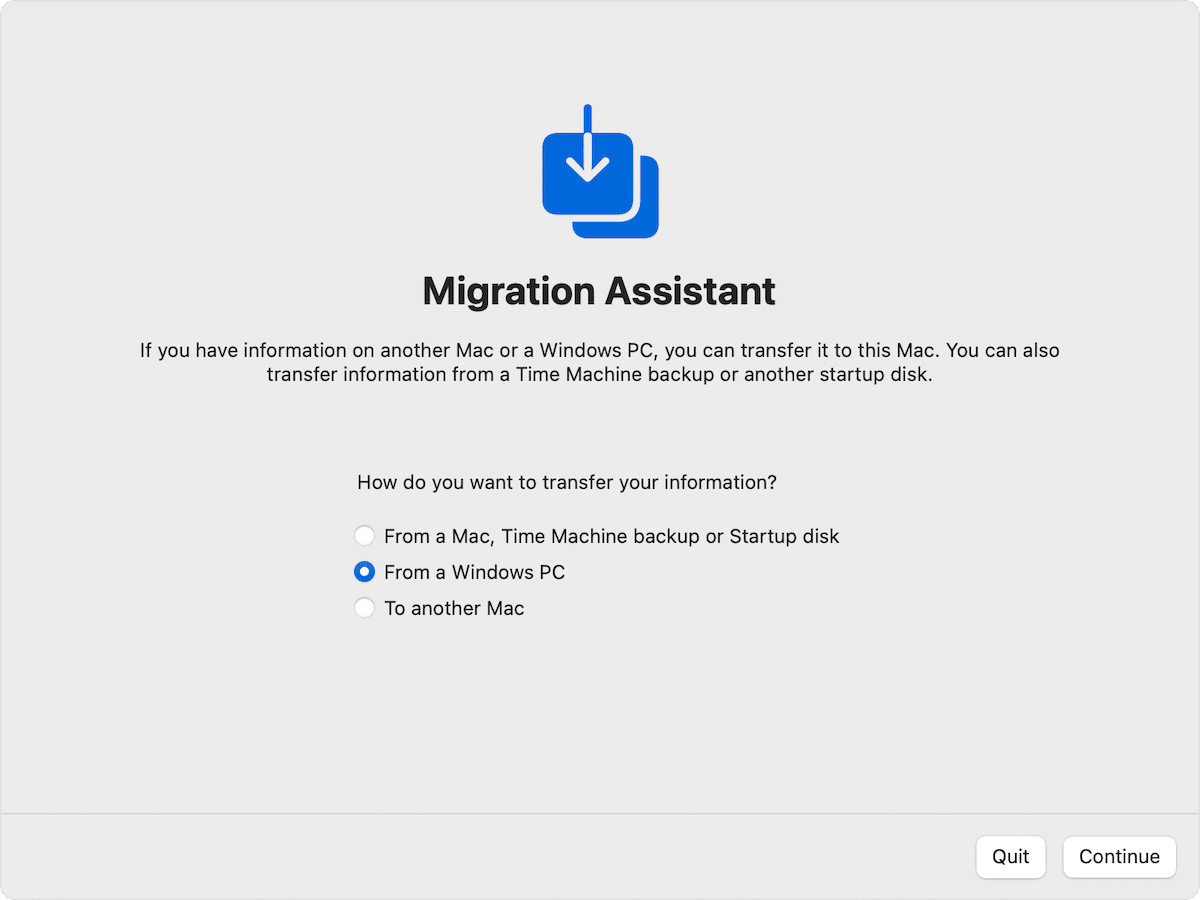 - MacOS Ventura ve MacOS Monterey için Windows PC'ye Geçiş Asistanı yükleyinBurada.