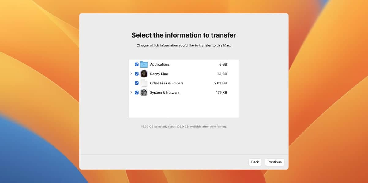 - Yeni Mac'te, eski makineden aktarmak istediğiniz verileri/içeriği seçin: uygulamalar, kullanıcı hesabı, dosyalar ve klasörler, sistem ve ağ ayarları.