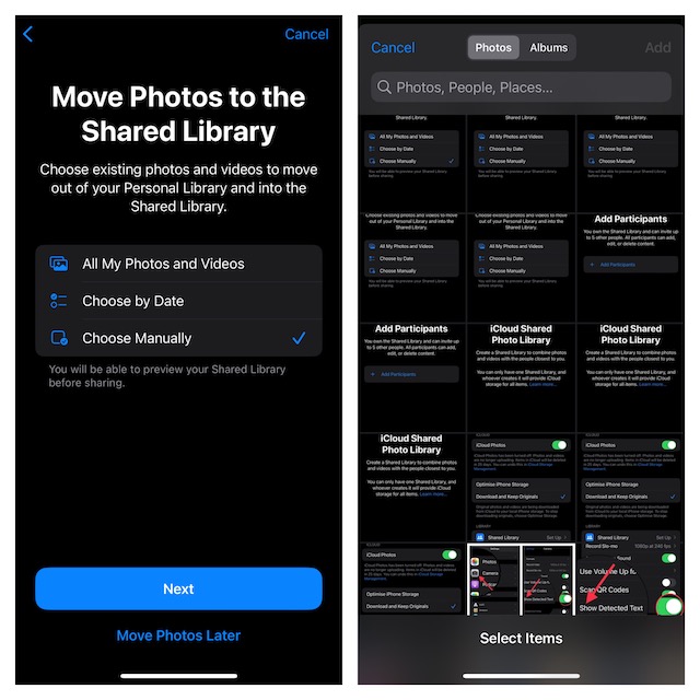 - Fotoğrafları manuel olarak seçin:Paylaşılan kütüphaneye eklemek istediğiniz fotoğrafları manuel olarak seçin.