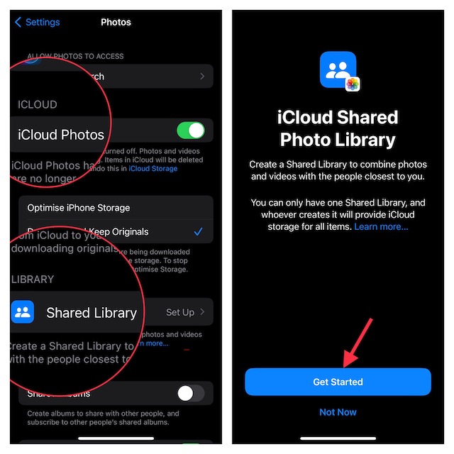 3.Sonra emin olunIcloud fotoğraflarıetkin. Sonra dokununPaylaşılan Kütüphane.