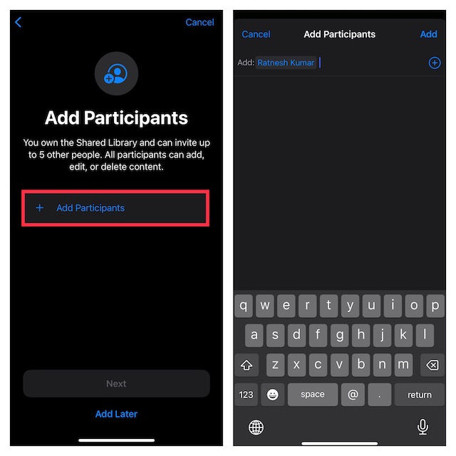 3.Sıradaki, dokunun"Katılımcılar ekleyin"Ve sonra arkadaşlarınızı Mesajlar uygulaması veya bir bağlantı aracılığıyla davet edin.