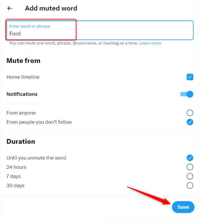 - Sonunda, sessizleştirmek istediğiniz terimleri ekleyebileceğiniz ekrandasınız. Metin kutusuna dokunun ve her seferinde bir terim girin. Ayrıca terimleri ve terimin sessizleştirilmesini istediğiniz süreyi nerede susturacağınızı da seçebilirsiniz. MuslukKaydetmekişiniz bittiğinde.