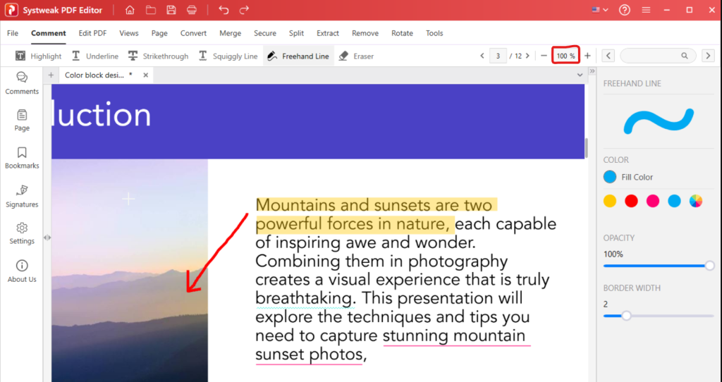 Systweak PDF düzenleyicisinin en üstünde, PDF'nizde gezinirken çeşitli durumlarda yardımcı olabilecek yakınlaştırma ve çıkış özelliğini bulabilirsiniz-