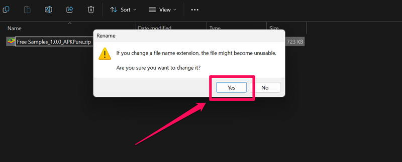 5.Aşağıdaki istemde, Windows 11 size APK dosyasını yeniden adlandırmanın (ve dönüştürmenin) platformda kullanılamaz hale getirebileceğini söyleyecektir. TıklayınEvet Düğmesieylemi onaylamak için.