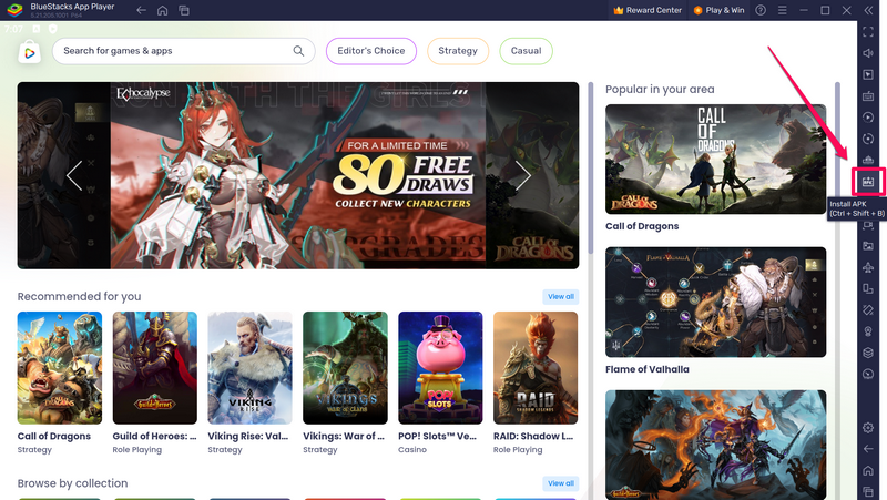 10.Sonra tıklayabilirsinizAPK düğmesini kurunüzerindeSağ menü çubuğu. Alternatif olarak, Bluestacks içinde aynı eylemi gerçekleştirmek için Ctrl + Shift + B'ye basabilirsiniz.