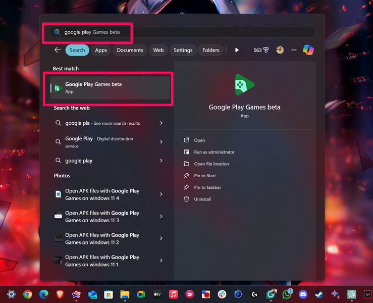 7.Şimdi, açmak için Windows + S kullanınWindows Arama-Google Play Games uygulamasını bulun, VeAçmak için tıklayın.