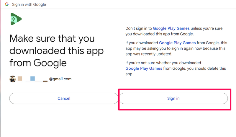 9.FEkrandaki talimatları takip edinVe tıklayınOturum Aç düğmesiResmi Google web sitesinden Google Play Games uygulamasını indirdiğinizi onaylamak için. Bu, Google Play Games uygulamasını taklit edebilecek herhangi bir kimlik avı uygulamasına Google hesap kimlik bilgilerinizi sunmanızı önlemek içindir.
