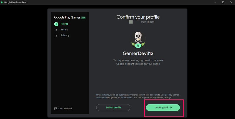 10.Mevcut Google Play oyunları profilinizi seçin veya başka birine geçin. Tıklayınİyi görünüyor düğmesiişiniz bittiğinde.