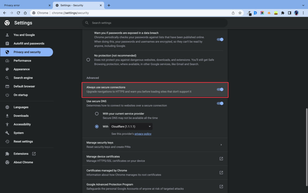 Her zaman Güvenli Bağlantılar Seçeneği'ni açmak için Google Chrome'daki bu talimatları izleyin: