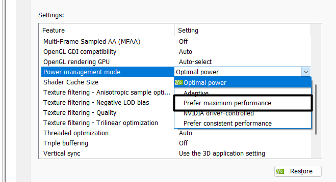 2.AyarlamakGüç Yönetimi Moduaçılır menüMaksimum performansı tercih edinseçenek.