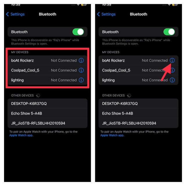 2. Cihazımın altında, iPhone veya iPad'iniz tarafından eşleştirilen tüm cihazları bulacaksınız. DokunBilgi simgesiKaldırmak istediğiniz cihazın yanında.