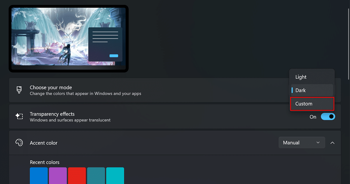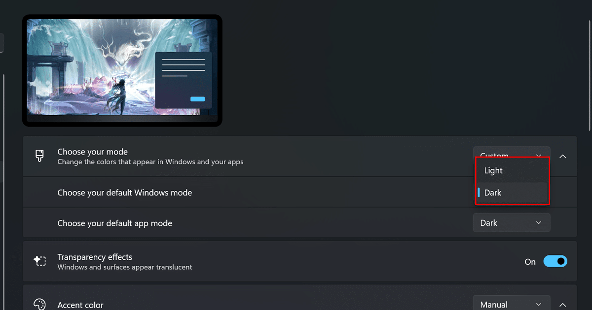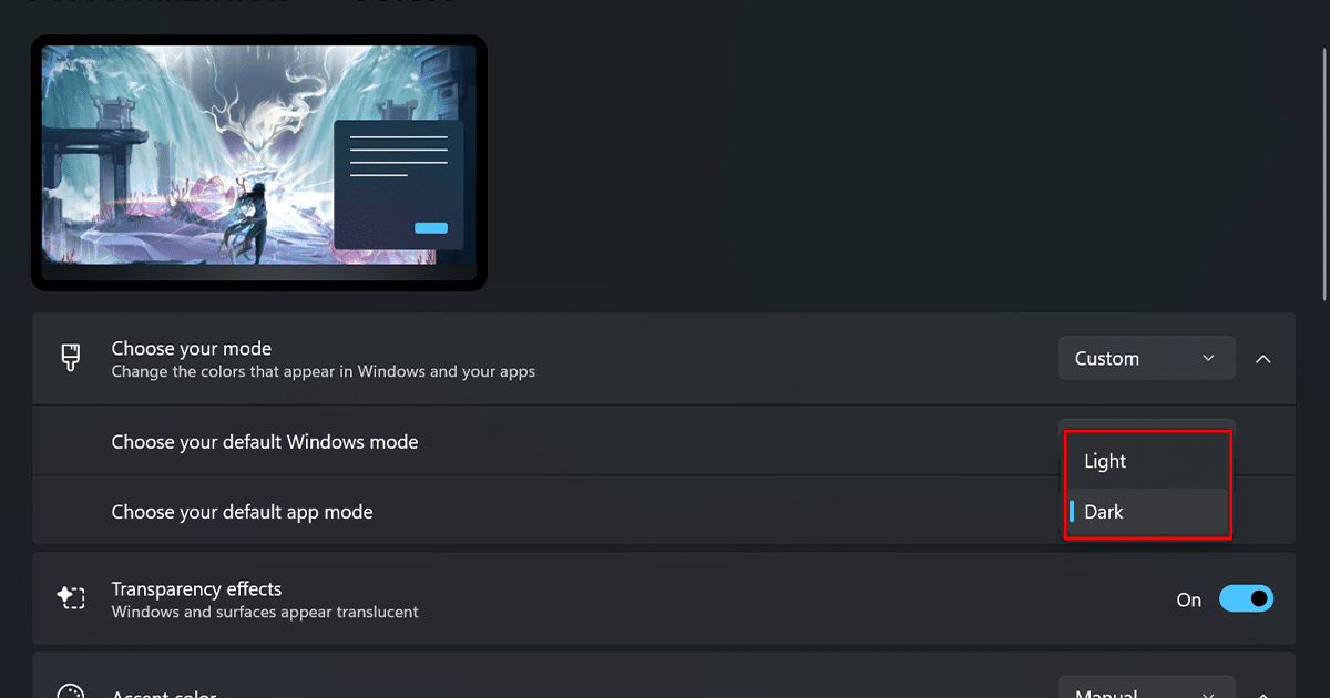 - İçindeVarsayılan Windows modunuzu seçin, seçmeKaranlıkveyaIşık.