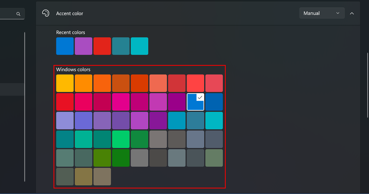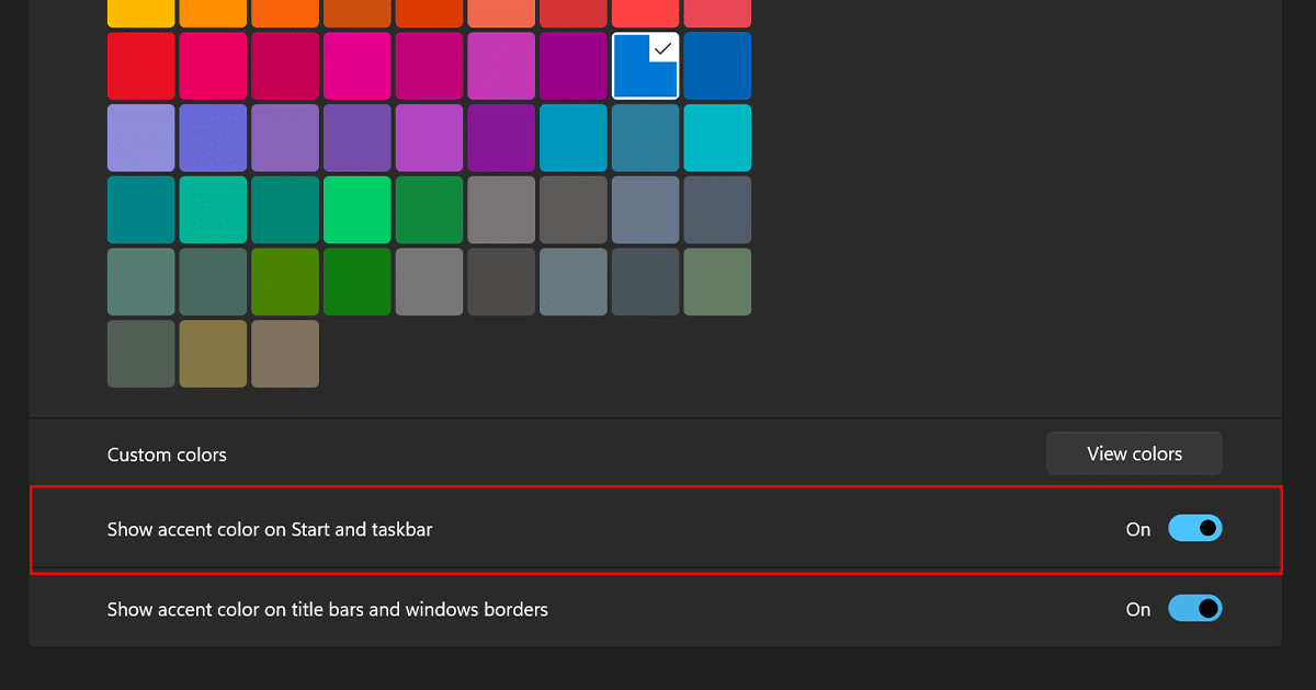- AltındaAksan rengi, görev çubuğu için yeni rengi seçin (veBaşlat menüsü).