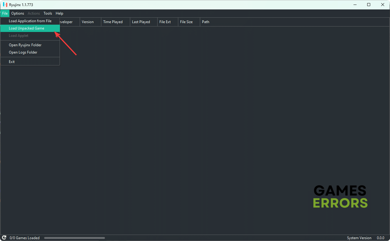 6. Ryujinx'te dosyaya tıklayın ve ardından indirilen oyun dosyasına bağlı olarak bir dosyadan paketlenmemiş oyunu veya yükleme uygulamasını tıklayın.