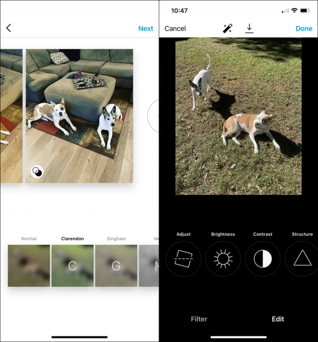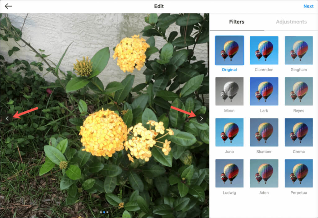- Bitirdiğinizde seçinSonrakisağ üst köşede veFiltrelerveyaAyarlamalarResimlerinizi geliştirmek için. Her bir fotoğrafta tek tek filtreler veya ayarlamalar için resimlerdeki okları kullanarak hareket edebilirsiniz.