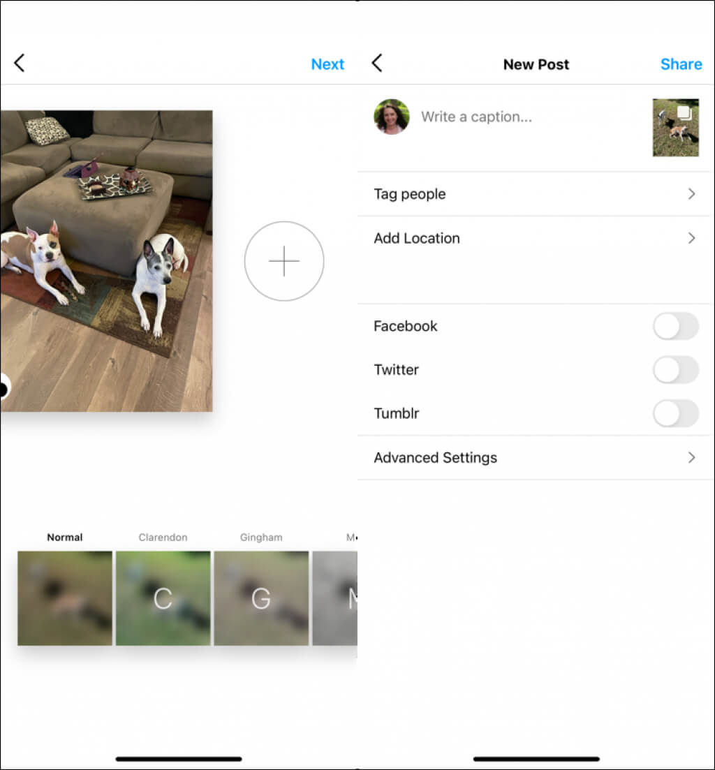 - SeçmeSonrakiVe gönderinizi normalde yaptığınız gibi tamamlayın. İnsanları etiketleyin, bir altyazı ekleyin veya bir konum ekleyin.