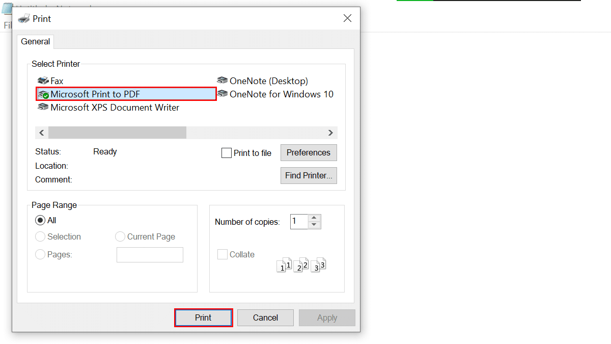 - "PDF'ye Microsoft Print" veya "PDF olarak kaydedin”Seçenek (uygulamaya bağlı olarak)> Yazdırma düğmesini tıklayın.