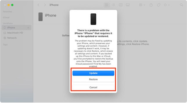 6.Daha sonra, iPhone'unuzda “iPhone“ iPhone ”ile güncellenmesini veya geri yüklenmesini gerektiren bir sorun var” gibi bir şey belirten bir açılır uyarı görünecektir.