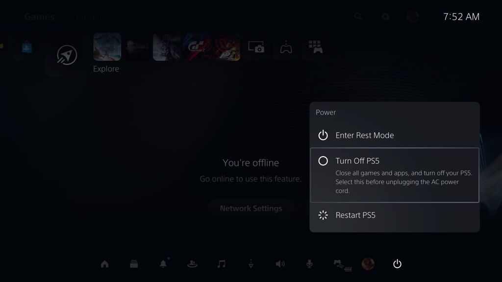 - BasınPS düğmesiDualSense kablosuz denetleyicinizde,Güçsimge ve seçinPS5'i kapat. Konsol donmuşsa veya ekran boşsa,Güçzorla kapatma başlatmak için düğme.