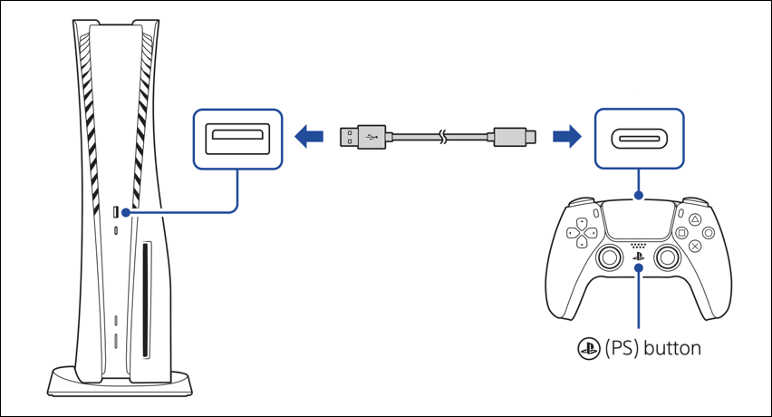 - DualSense denetleyicinizi bir kablo üzerinden konsolun önündeki veya arkasındaki bir USB bağlantı noktasına bağlayın.