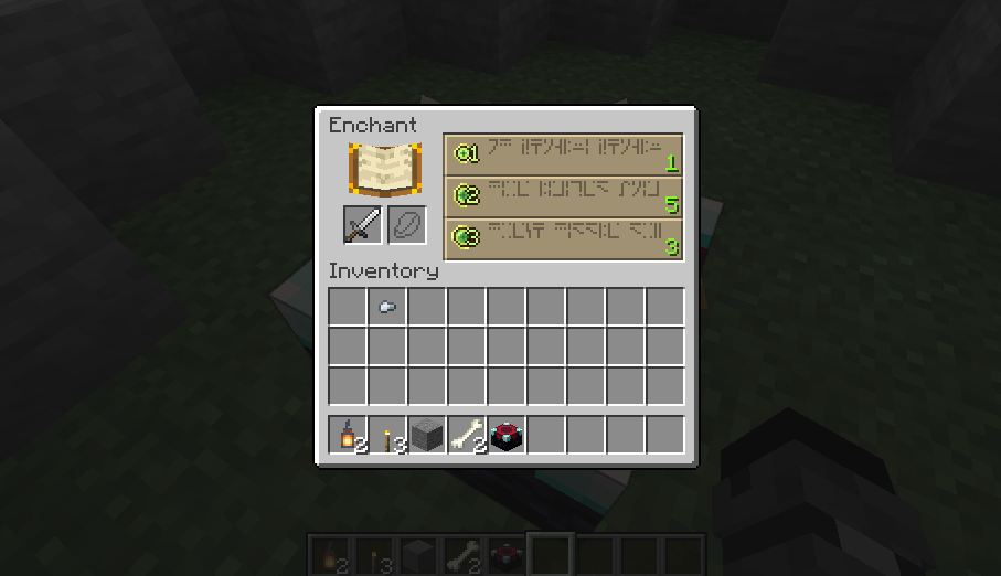 Bu randomizasyon oyun sistemlerinin diğer yönlerinde de görülür. Örneğin, Minecraft'ın Enchantment tablosu, her büyülemeyi, bir bakışta kararsız, garip görünümlü bir dilde bir kelime koleksiyonu olarak görüntüler.