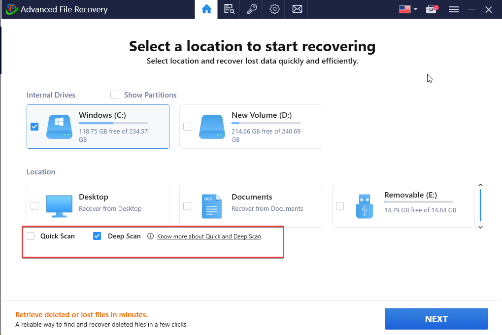 4. Adım -Tarama modunu seçin. Kontrol etmenizi öneririzDerin taramaSilinen dosyaların derinlemesine taranması ve daha iyi veri kurtarma şansı için onay kutusu.