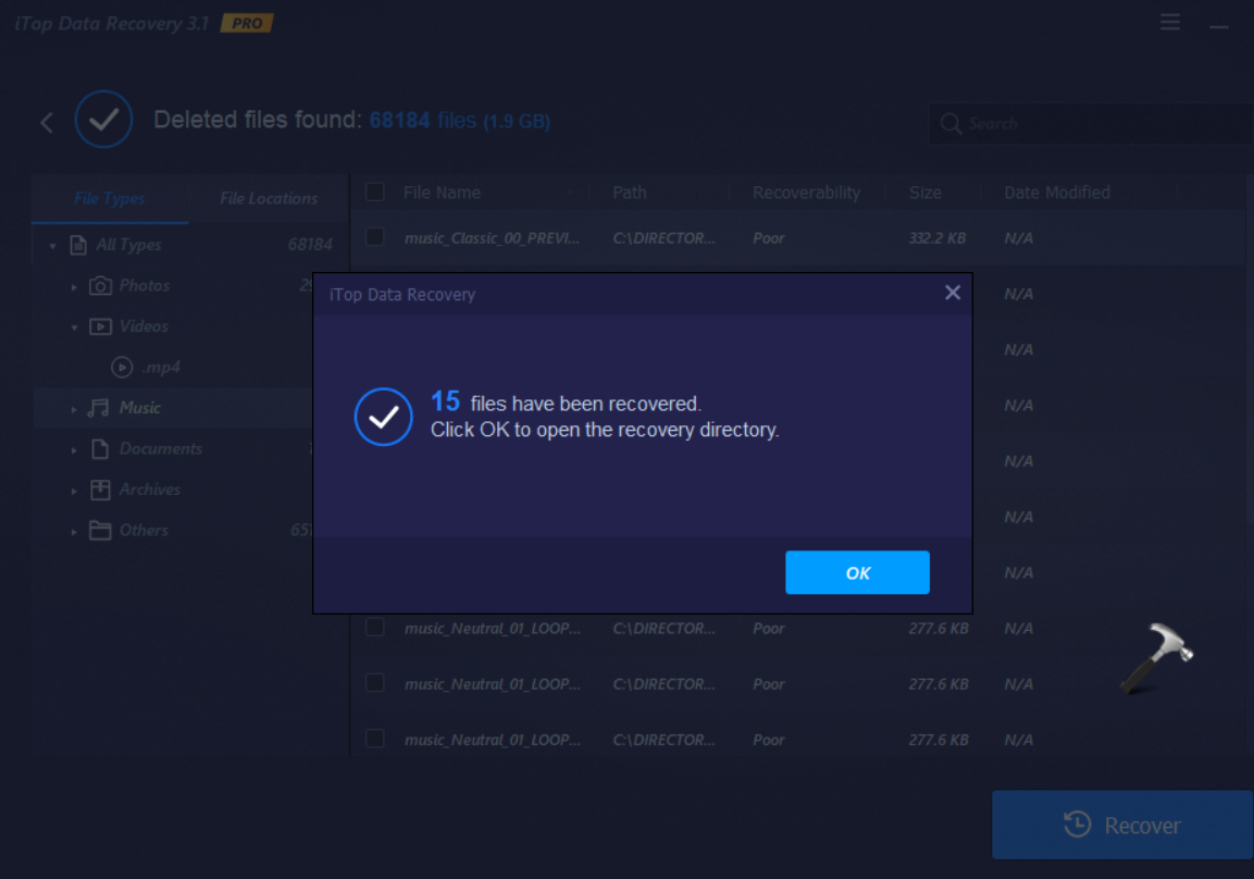 6.Kayıp dosyalar bir süredir kurtarılacak. Son olarak, basınTAMAMKurtarma dizini açmak için.