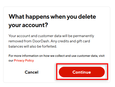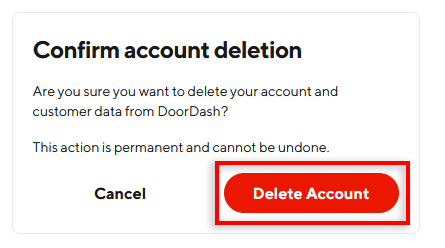 Not:Bu eylem kesindir ve hesap bilgilerinizi, telefon numaranızı, ödeme bilgilerinizi, Doordash kredilerinizi, dashpass ve hesabınıza bağlı Doordash hediye kartlarını silecektir.