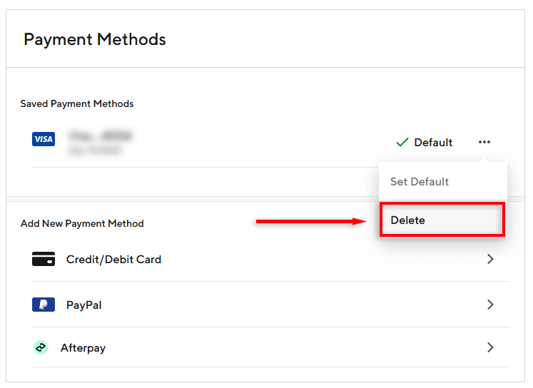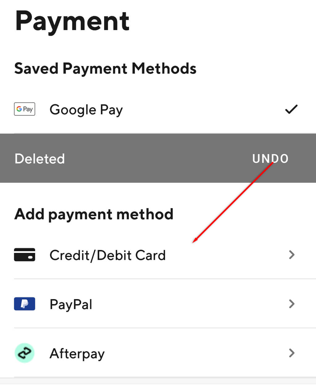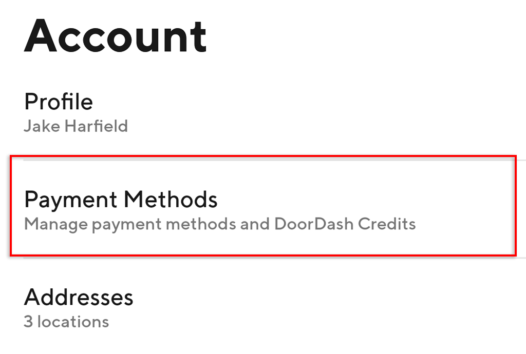 Yukarıda belirtildiği gibi, kredi kartınızı yalnızca varsayılan ödeme yöntemi değilse Doordash'tan kaldırabilirsiniz. Başka bir deyişle, kartınızı silmek için yerine başka bir ödeme yöntemi eklemeniz gerekir.