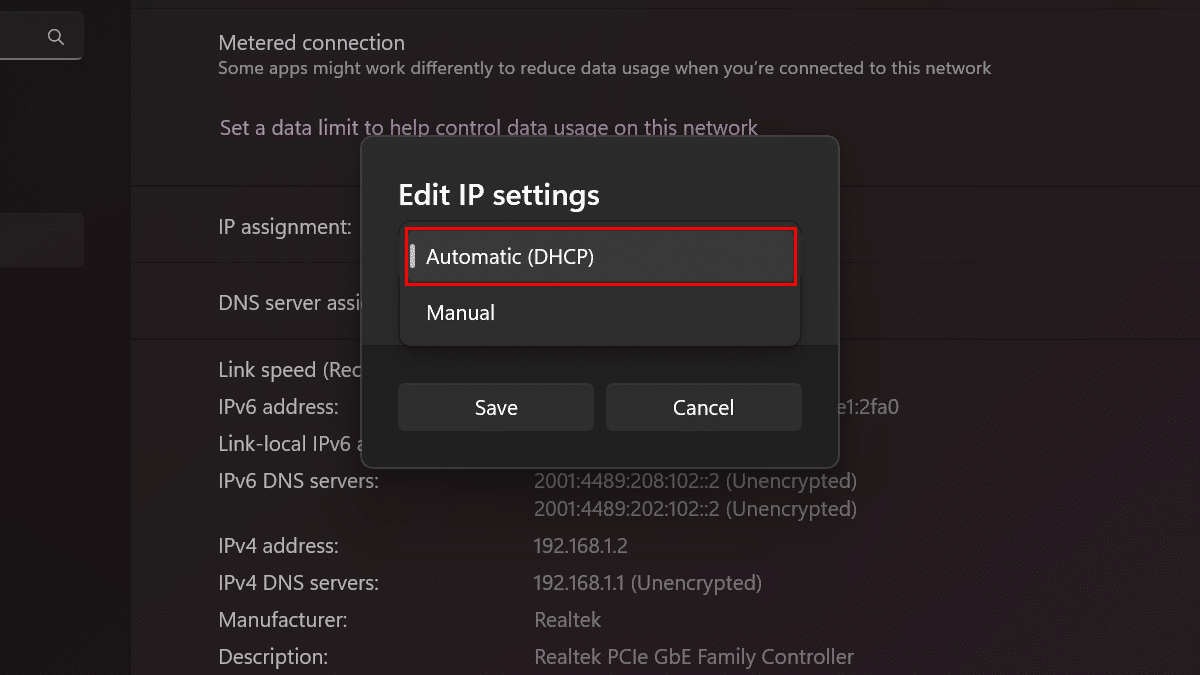 - Tamamlandığında, Windows 11 statik olarak atanan TCP/IP yapılandırması kaldırılır ve bilgisayarınız DHCP sunucunuzdan dinamik bir IP adresi kullanır.