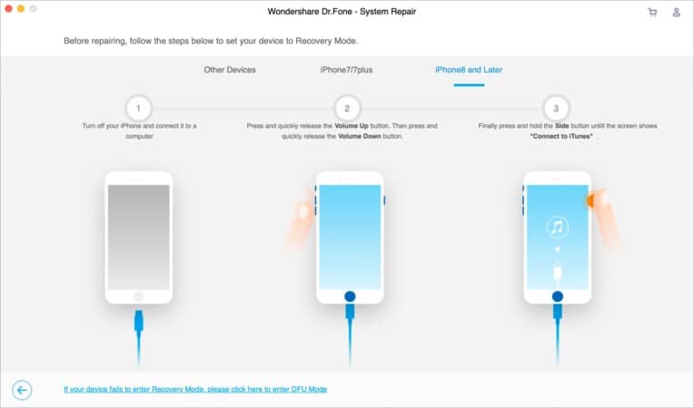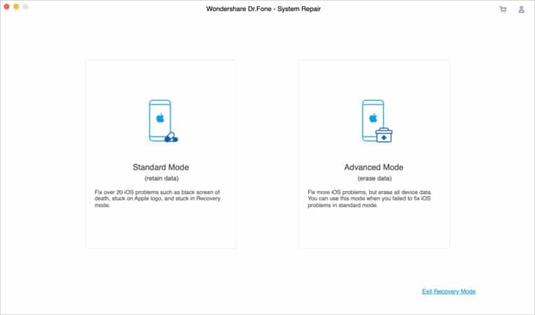 Wondershare Dr.Fone'daki araç kutusundan sistem onarımı açtığınızda, iPhone'unuzu Mac veya Windows PC'nize bağlamanızı isteyecektir. İPhone'unuzu bir kablo üzerinden veya kablosuz olarak bağlayabilirsiniz. Ardından, standart ve gelişmiş mod arasında seçim yapmanız gerekecek.