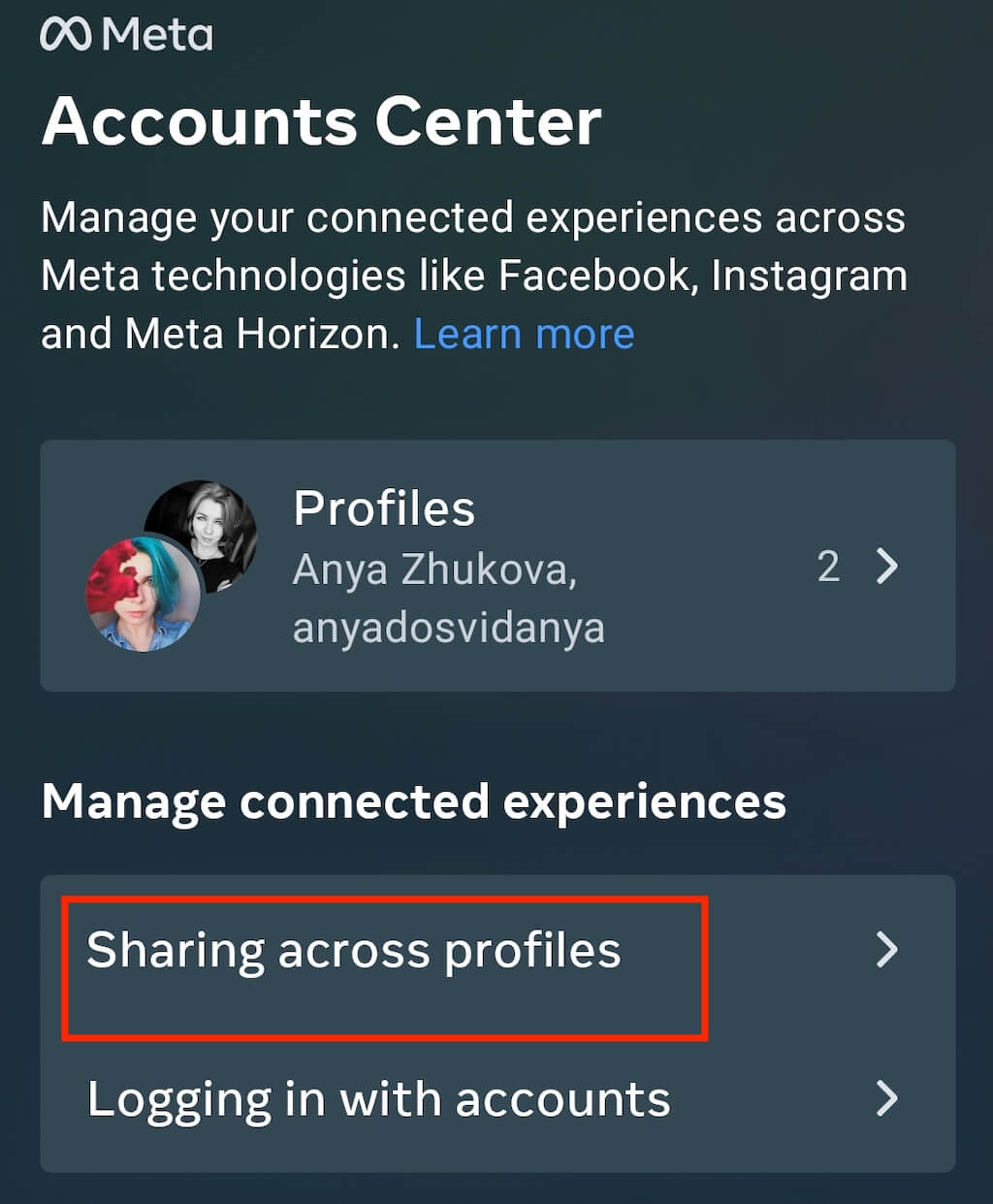 - Aşağı kaydırın ve seçinHesap merkezialtındaMeta.