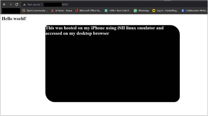 https://194.173.12:8000Şimdi, masaüstünüzdeki veya aynı ağı iPhone'unuzla paylaşan ve sunucu adresini arayan (IP adresini içeren) tarayıcıyı açın. Bu, boş bir sayfa veya ISH varsayılan dizinlerini içeren bir sayfa açacaktır. Tabii ki, bununla hiçbir şey yapamazsınız. HTML proje dosyanız sunucuda çalıştırmak için ISH dizininin içinde olmalıdır.