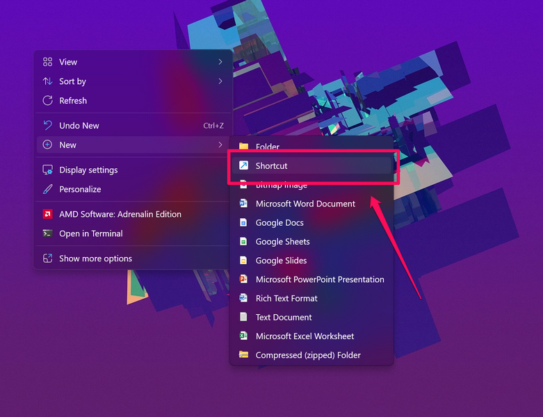 2.İmleciYeniseçenek ve ardından seçinKısayolTaşma menüsünden seçenek.