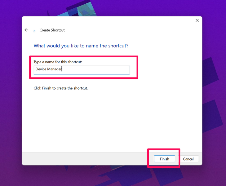 4.Aşağıdaki pencerede,kısayol için bir isim sağlayınVe tıklayınSona ermekdüğme. Bu durumda, bunu “Cihaz Yöneticisi” olarak adlandırdık.