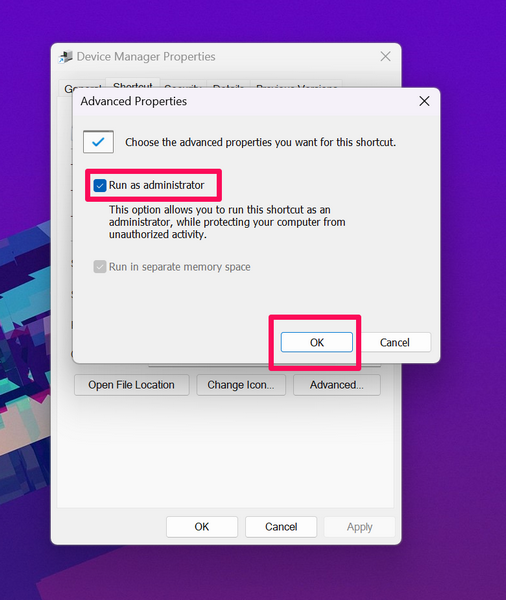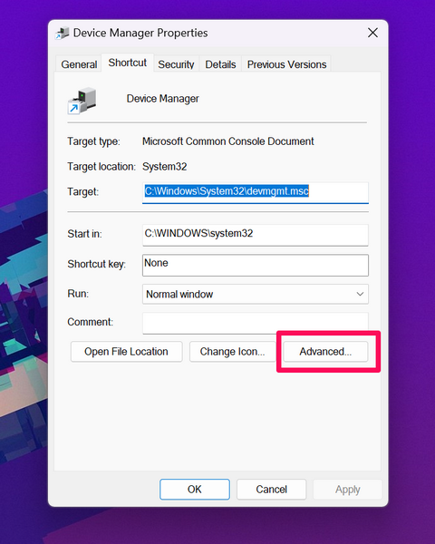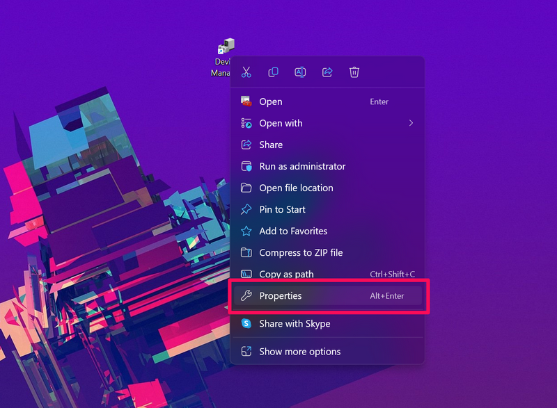 6.Ancak, cihaz yöneticisi kısayolunun her açtığınızda yönetici olarak çalıştırılmasını istiyorsanız,ÖzelliklerBağlam menüsünde seçenek.