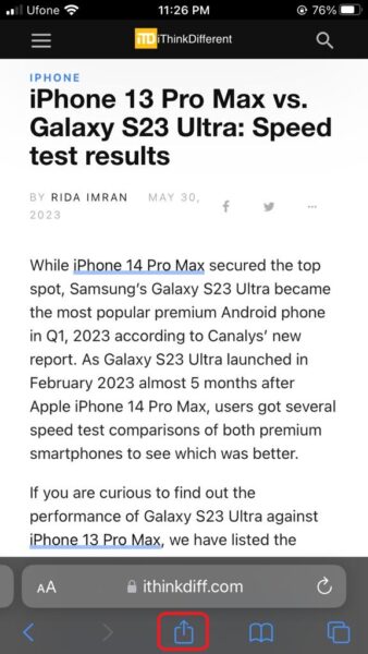 - Belgeyi veya web sayfasını açtıktan sonra Paylaş düğmesini arayın. Genellikle yukarı doğru işaret eden bir ok olan bir kare olarak görünür ve ekranın üstünde veya altında bulunur. Devam etmek için Paylaş düğmesine dokunun.