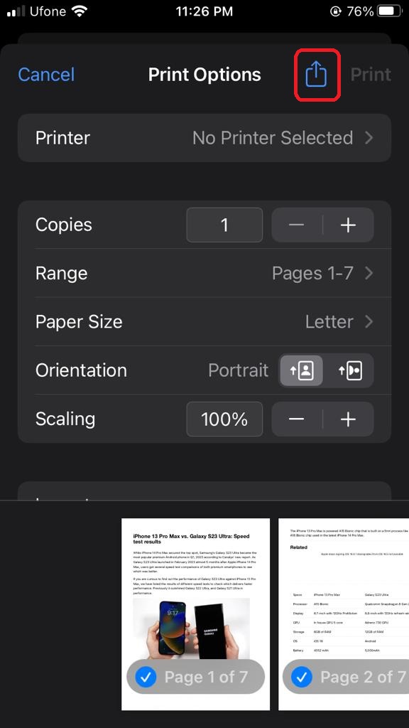 - Seçtikten sonraBasılı, ekranınızda belgenin bir önizlemesi görünecektir. Gerekirse görünümü ayarlamak için sıkıştırma hareketlerini kullanabilirsiniz. Tüm belgenin görünür ve uygun şekilde biçimlendirildiğinden emin olun.