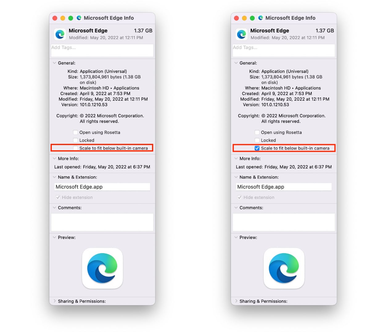 Yeni MacBook Pro modelleri için güncellenmeyen bu tür uygulamalar için Apple, uygulama başına etkinleştirilebilecek bir özellik geliştirdi. “Dahili kameranın altına sığması için ölçeklendir” olarak adlandırılan bu işlev, menü çubuğunu ve uygulama pencerelerini kamera çentikinin altında görünmeye zorlar, bu da dikey görüntüleme alanını etkili bir şekilde azaltır, ancak menü çubuğunuzun çentik tarafından engellenmesini sağlar.