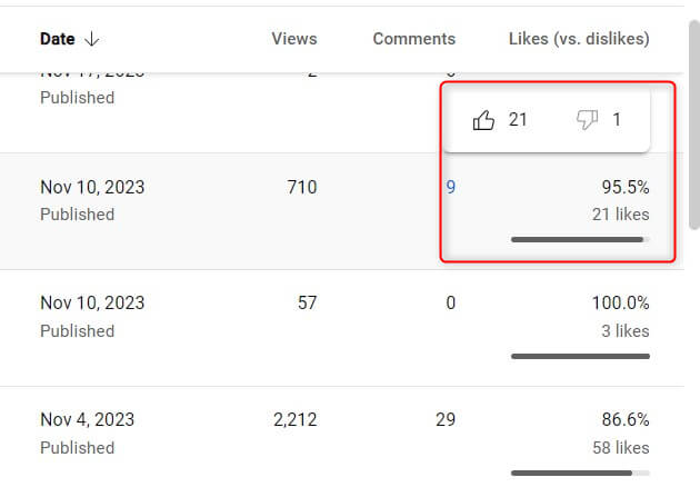 - Videolarınızın bir listesini ve eşlik eden verilerle birlikte göreceksiniz. Bu veriler arasında birBeğeniler (hoşlanmayanlar)kolon. İmlecinizi numaranın üzerine getirin ve beğenilmeyenler açılır pencerede görünecektir.