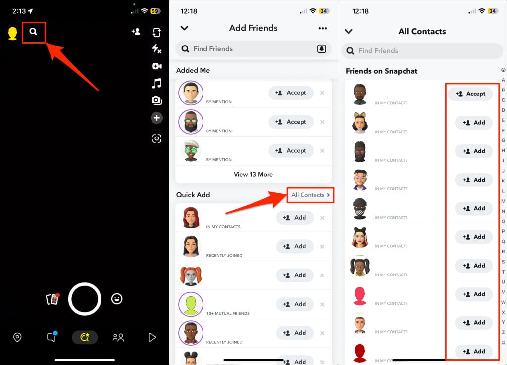 Arkadaşlar listenizdeki birini bulamıyor musunuz? Bunları kişilerinizden, arama, snapcode veya hızlı ekle ile ekleyebilirsiniz.